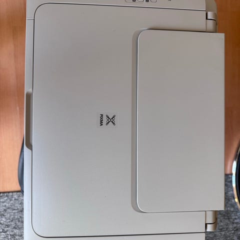 Canon Pixma TS5320S multifunksjonsskriver med fargeutskrift, skanning og kopiering. Skriveren støtter A4-format og har en liten LCD-skjerm for enkel betjening. Enheten er hvit og svart, og egnet for hjemme- eller kontorbruk.