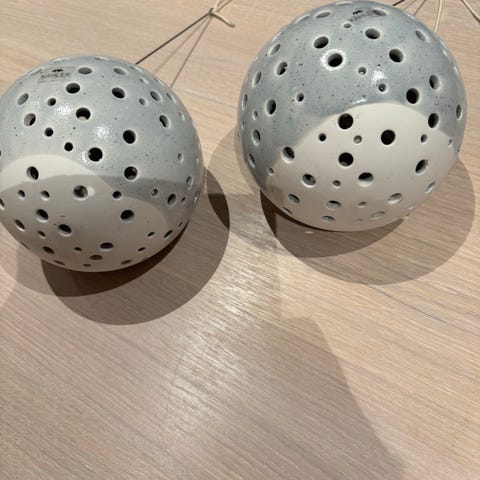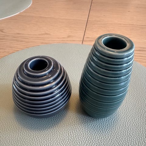 Lysestakene har ulik høyde og utførelse, men samme serie og uttrykk. De fungerer godt sammen som et par, enten på spisebord, skjenk eller i en vinduskarm. Glansen i glasuren er jevn, og overflatene fremstår uten sprekker eller skår. Kun mindre bruksspor på undersiden.
