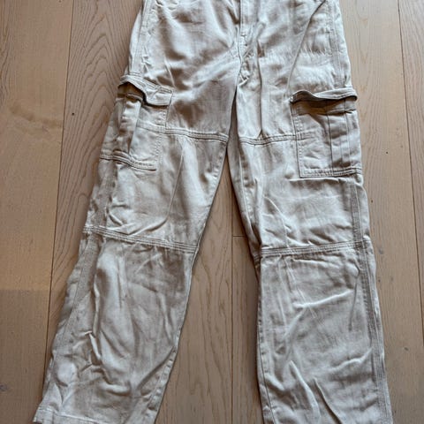 Flotte, kule, meget pent brukte H&M Divided grønne Cargo bukser str 38 2 sidelommer i midje og 2 sidelommer på lårene. 1 ekstra lomme lavt på høyre bukseben. Se bilder for detaljer. Rette ben. Brukt 1 gang. 100 % bomull. 40 grader maskinvask.