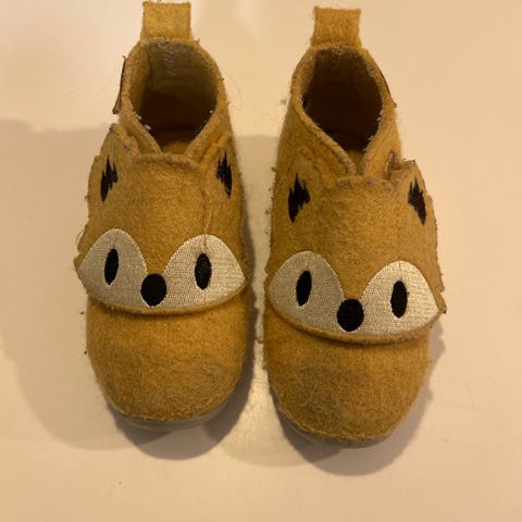 Ponny Unisex barne tøfler i størrelse 23, laget av beige ullmateriale. Tøflene har en myk såle og et dekorativt design med et dyremotiv på forsiden. Egnet for barn, gir komfort og varme til innendørs bruk.