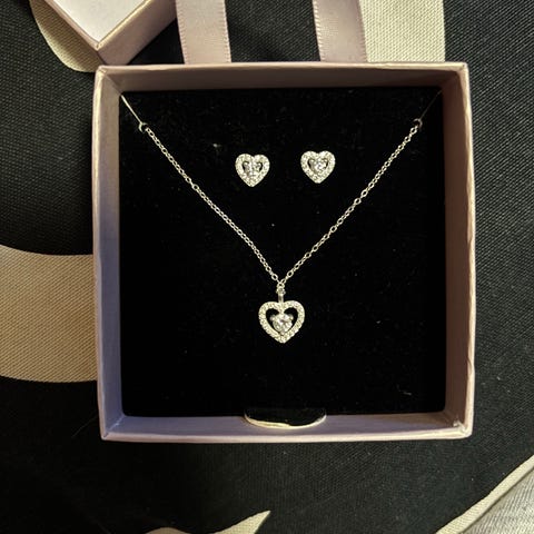 Smykkene er nye og er ikke brukt (har ikke lapp) Halskjede med hjerte og to sett med øredobber. Farge sølv. (Forsølvet)