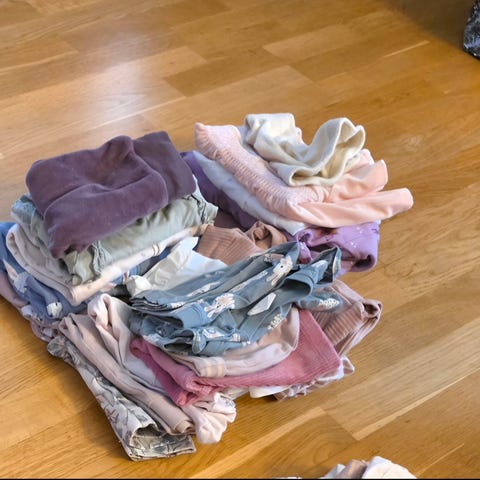 Klær fra str 50-80. Det er flere fleecesett, jakker, pyjamaser, bodyer, bukser og overdeler, sokker, ull. Ca 100 plagg, 10 kr plagget, 1000 kr klespakka. Pent brukt