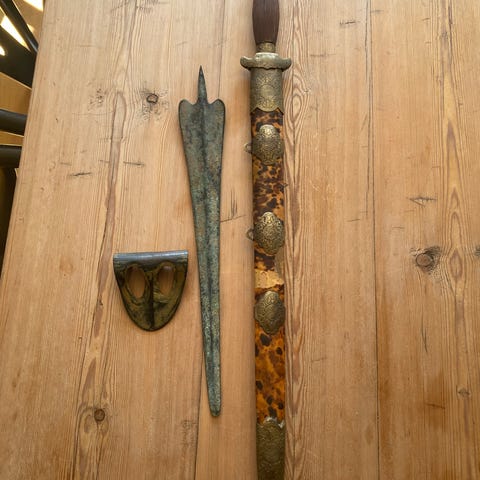 Ukjent merke Tradisjonell spyd og skjold sett laget av metall og lær. Inkluderer to spyd med metallspisser og et skjold med lærremmer. Kan brukes til dekorasjon eller samling av historiske gjenstander.