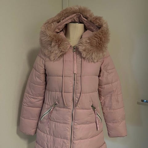 Jakken har hette med pelskant og glidelås foran. Materialet er polstret for varme og komfort.