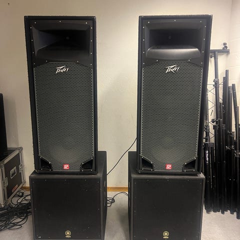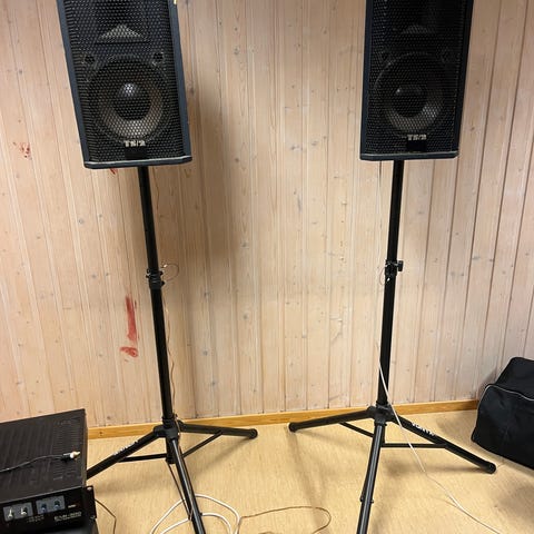 Dj-tech PA system med sub, 2 høyttalere og kabler. Stativ til høyttalere følger med, men disse kan også festes på vegg.