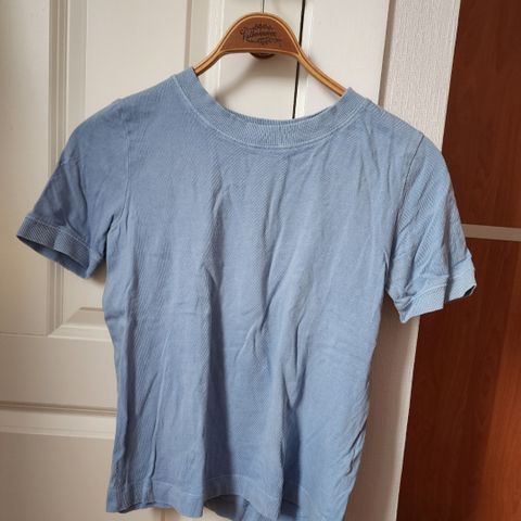 H&M T-skjorte i blå farge og litt tjukkere materiale, størrelse S. Korte erme og rund hals. Sitter veldig fint på!