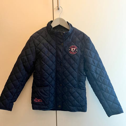Hampton Republic 27 jakke i blå farge for barn, størrelse 164, designet for gutt. Jakken har quiltet mønster og glidelås foran, med to lommer med knappelukking. Materialet er ikke spesifisert, men jakken er egnet for utendørs bruk og gir varme og komfort.