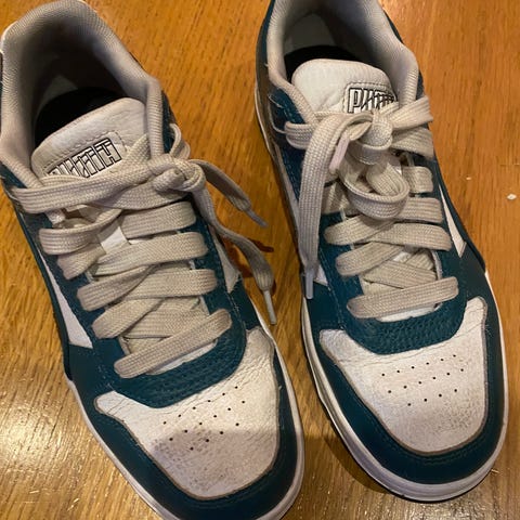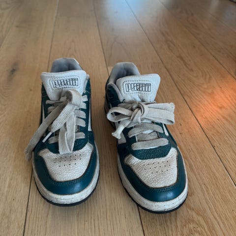 Puma sneakers for barn, unisex, størrelse 37. Skoene er hvite med grønne detaljer og har snøring. Materialet ser ut til å være en kombinasjon av tekstil og syntetisk materiale. Sålene er gummierte med mønster for grep. Skoene er egnet for daglig bruk. Limen rundt ene skolissen er gått bort. Kan løses med blank tape. De fleste gjemmer lissene i skoen🤭