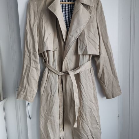 «Denne trenchcoaten har en oversized passform og et glatt, mykt materiale i uekte semsket skinn. Den har polstrede skuldre og et jakkeslag. Vår trenchcoat har en dobbeltknappdesign, en knappedetalj på ermene, sidelommer med fallsøm og et knytbart belte med en beltestropp.»