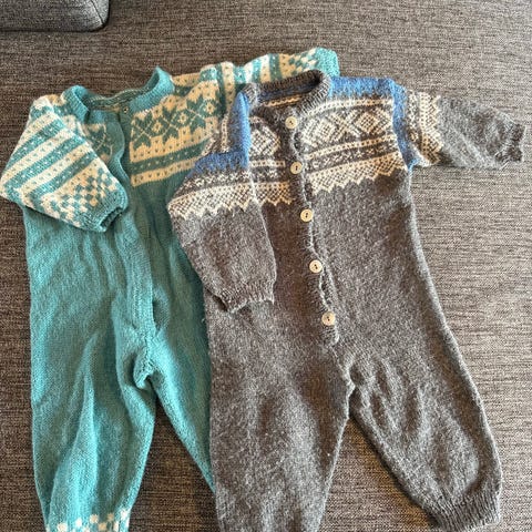‘Regndråpe heldress’ strikket i Sandnes garn (ull). Nydelig grønnfarge med fine detaljer og knapper i trefarge. Str 62. Ubrukt, kun vasket en gang på ullprogram.