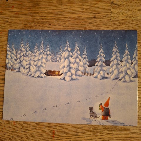 Skal egentlig brettes i 2 til et stående julekort, men er fremdeles «ubrettet». Helt og fint.