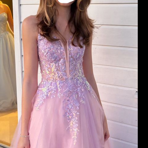 Nydelig lyseblå farge, og flere lag med lysegrå tyll med glitter utenpå.