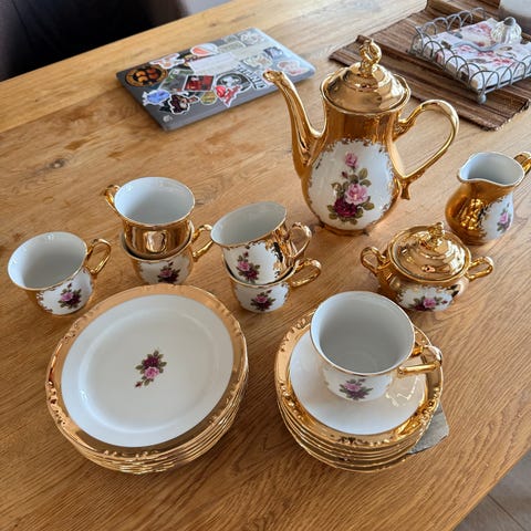 Pent eldre mocca sett, 1 kanne, sukker skål med lokk, fløtemugge og 6 kopper med skål selges samlet