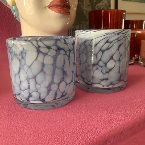 Lysestaker og krukke med lokk i matt mintfarget glass og gullfargede riller.