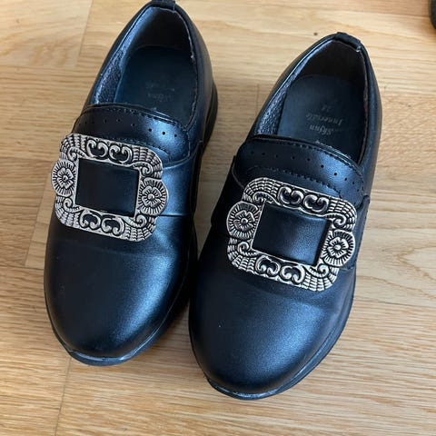 Klassiske bunadsko til barn, svarte med flott sølvfarget spenne foran. Passer perfekt til bunad, festdrakt og andre høytidsantrekk. Pent brukt, normal bruksslitasje.