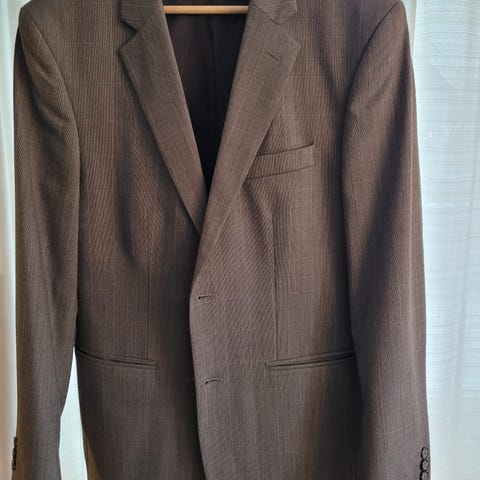 Dressmann dressjakke i brun farge, størrelse 50 for menn. Jakken har klassisk snitt med to lommer foran og fire knapper på ermene.
