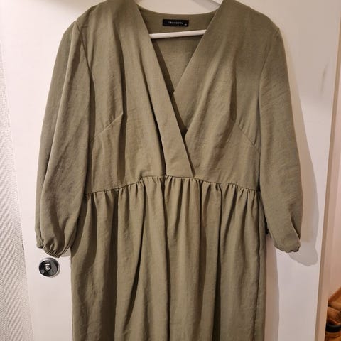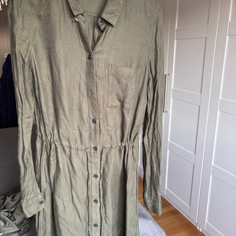 Grønn med mønster. Knapper i halsen og strikk nede på ermer.