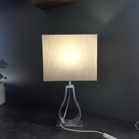 Selger en pen bordlampe med lys skjerm og sølvfarget metallfot. Lampen fungerer som den skal og gir et fint, mykt lys.