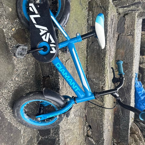 Barnesykkel med 12 tommers hjul. Litt slitasje på bakdekk og sete.