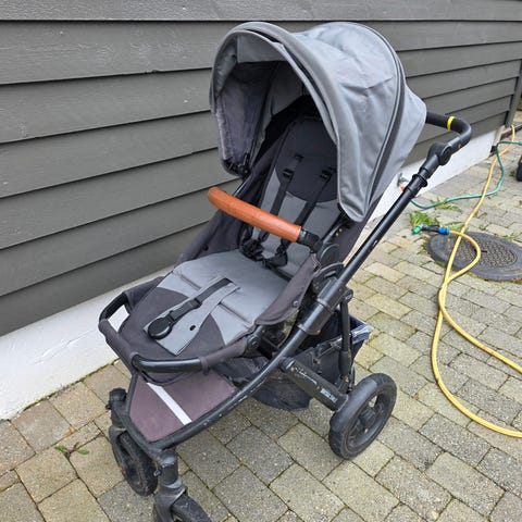 ABC Design barnevogn med kombinert liggedel og sportsdel i grått stoff. Vognen har justerbart håndtak med brun detalj, fire hjul med god fjæring og sikkerhetssele i sportsdelen. Egnet for barn i ulike aldre, til bruk både som liggevogn og trillevogn.