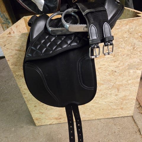 Møkkete tøysal til shetlandsponni selges billig. Grei nok for korte leieturer. Ikke noe særlig for lengre turer.