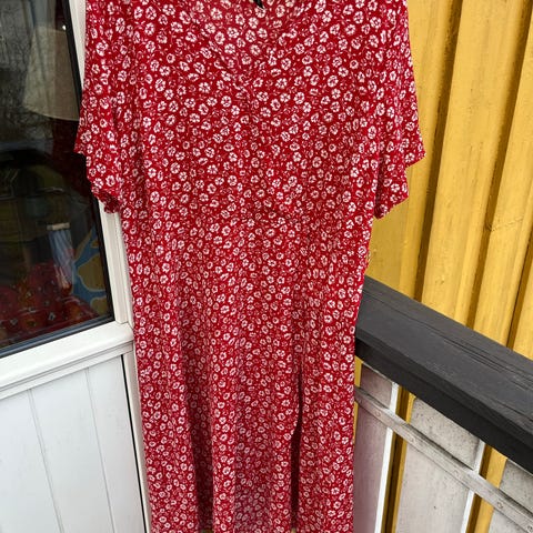 Lindex festkjole i lys rød farge, eller korall. Kjolen er i størrelse 50 og har en enkel, ermeløs modell med rund hals. Behagelig kjole med god vidde i livet, kjolen henger løst over bryst og midje. Knelang.
