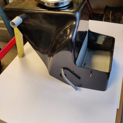Oljetank fra en 1955 AJS 18S i perfekt stand, komplett med filter, filterskrue og originalt tanklokk. Skjeldent funn!