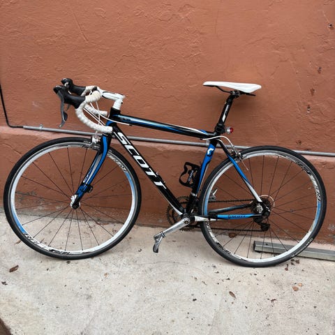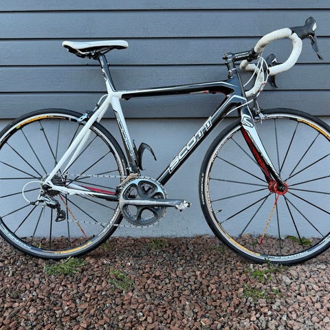 Scott Landevei sykkel for herre i svart og hvit farge. Sykkelen har en lett Carbon ramme og er utstyrt med standard landeveiskomponenter som gir effektiv ytelse på veien. Passer for landeveissykling og trening. Scoot addict R3, sykkel er nettopp servert,ny kjede,kasset og wirer, nye klikkpedaler og speedometer/trippteller m.m