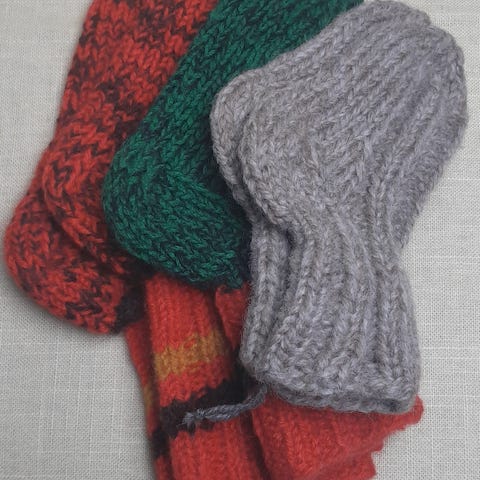 HJEMMESTRIKKET UNISEX LUER, BLÅ, RØD, OFFHWITE