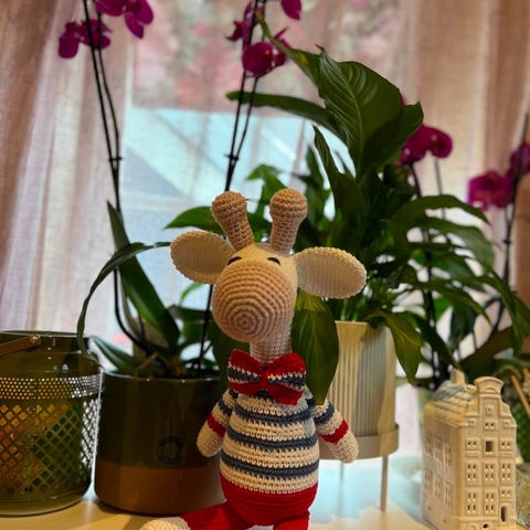Selger en helt ny, håndlaget heklet sjiraff på ca. 40 cm. Sjiraffen er laget med nøye håndverk og kvalitetsgarn, myk og detaljert. Perfekt som gave, barneromsdekorasjon eller til samlere av håndlagde figurer.