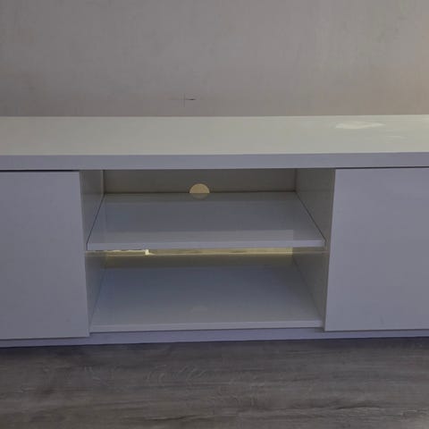 Selger et helt nytt og uåpnet TV-bord i moderne og elegant design, som passer inn i alle interiørstiler. Bordet har god oppbevaringsplass med romslige skap på hver side og en midtseksjon med stilrent sotet glass. Overflaten er hvit med detaljer, håndtak og ben i rustfritt stål i sølvfarge. Kvaliteten er svært høy, og bordet fremstår betydelig finere i virkeligheten enn på bilder.