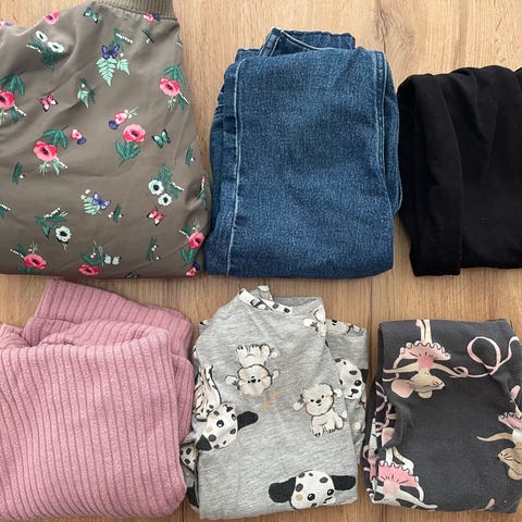 Klespakke med casual klær, str 98. Pent brukt. Nameit bestefartrøye, POP joggebukse grå, KAXS by KappAhl joggebukse grå, Lindex Kids joggebukse slim fit grønn, POP jeans i mørkeblå farge.