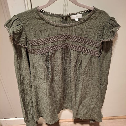 Camilla Pihl kjole i størrelse L, grønn. Kjolen har lange ermer og detaljer med rynking og hullmønster. Laget for kvinner og egnet til hverdagsbruk og fest.
