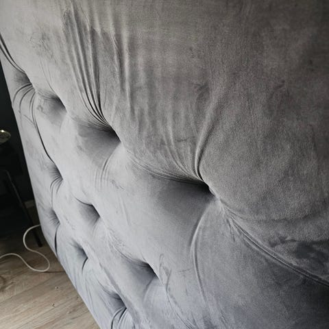 Pen ,lite brukt velour sengegavl i mørk grå farge.