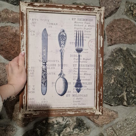 Shabby Chic bilde av kniv, skje og gaffel med "slitt" ramme 30cm x 40 cm