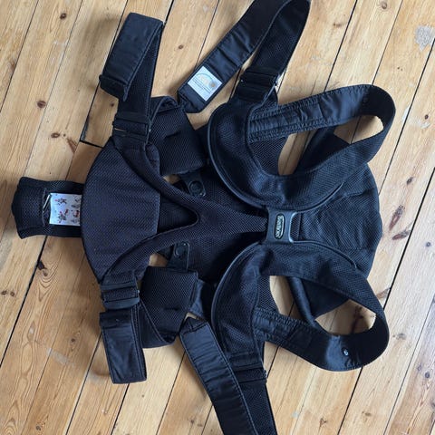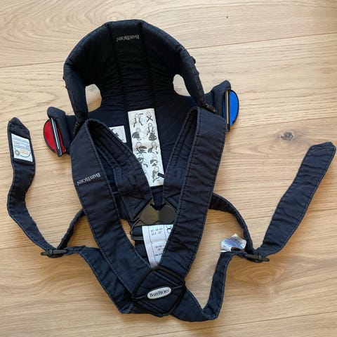 Babybjørn bæresele, godt og pent brukt, men kan uten tvil brukes til flere. Alle mekanismer fungerer. Fargen er grå/svart. Går i vaskemaskin. Veldig kjekk å ha.