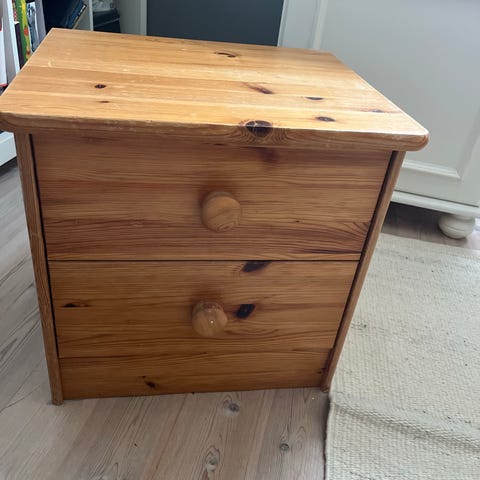 Nattbord laget i tre med hvit finish. Møbelet har en skuff øverst og et skap under med dør. Skuffen og skapet gir lagringsplass for små gjenstander og klær. Nattbordet har dekorative detaljer på sidene og en buet overflate.