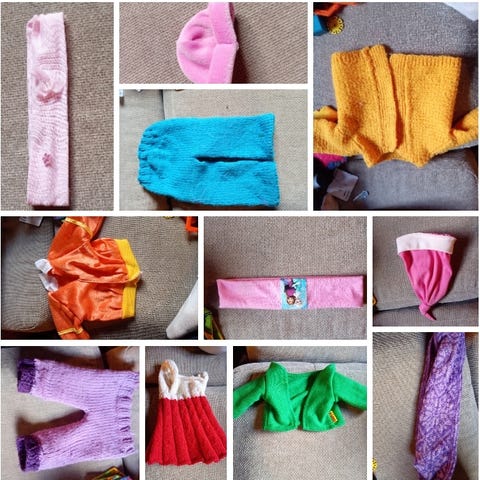 Pakke med hjemmelaget dukketøy selges samlet. Dukketøyet er laget av meg, og passer til dukke på størrelse med for eksempel Baby Born. Hentes i Langesund eller sendes med fiks ferdig.