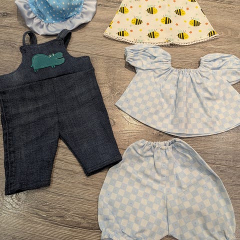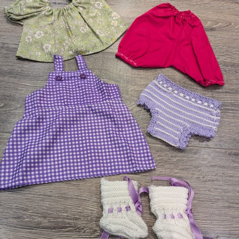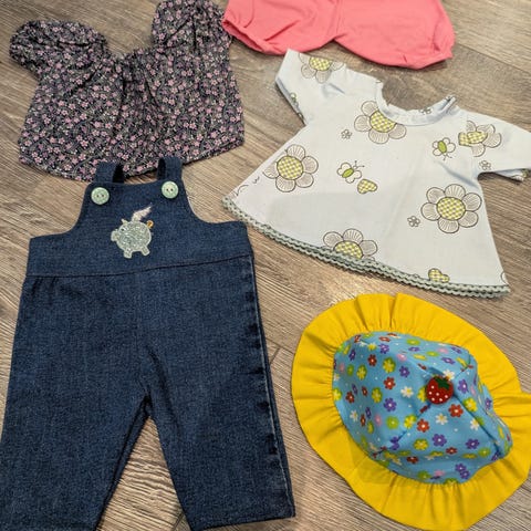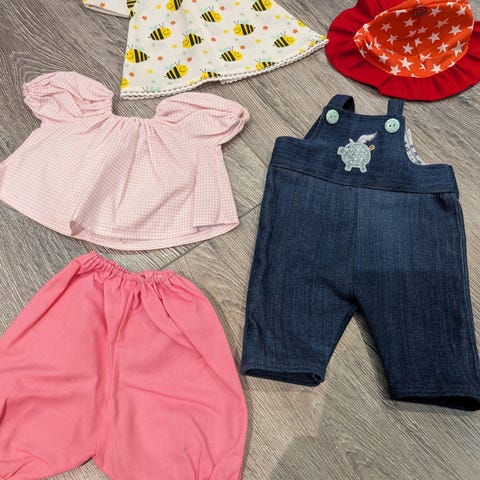 Pakke med hjemmelaget dukketøy selges samlet. Dukketøyet er laget av meg, og passer til dukke på størrelse med for eksempel Baby Born. Hentes i Langesund eller sendes med fiks ferdig.