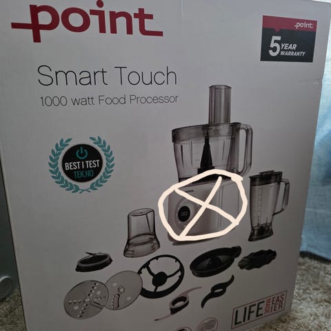 Braun Food Processor i hvit plast. Utstyrt med flere kniver og tilbehør for ulike matlagingsoppgaver. Har justerbar hastighetskontroll og en stor materør for enkel påfylling. Egnet for kutting, hakking og blanding av ingredienser.