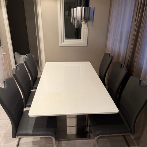 Selger en komplett og moderne spisegruppe kjøpt hos Living. Gruppen består av et stort høyglans uttrekkbart spisebord med glassplate og 8 eksklusive Calligaris designstoler. Perfekt for både hverdagsbruk og store selskaper.