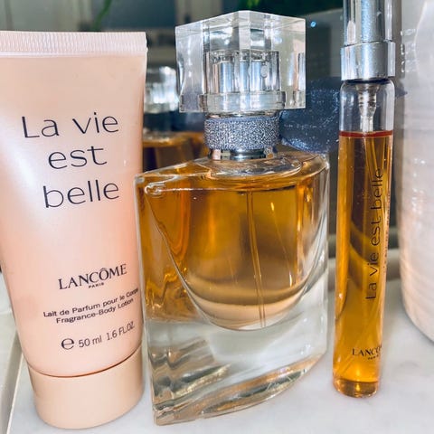Parfymen La Vie Est Belle, flasken rommer 50 ml. Den har ikke kork, og bare en liten del av parfymen har blitt brukt. Flasken er elegant og gjennomsiktig, med en varm, ravfarget væske. Perfekt for de som setter pris på klassiske og distinkte dufter