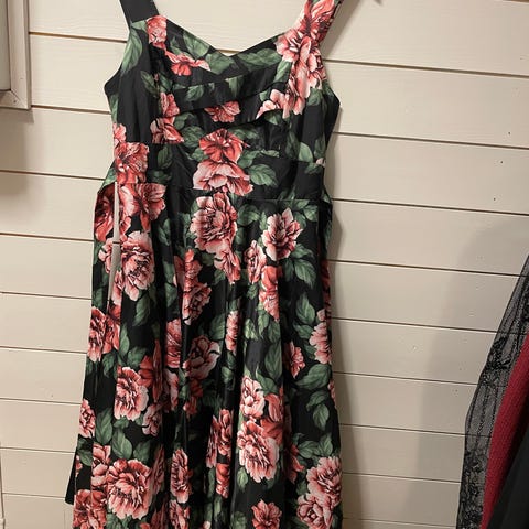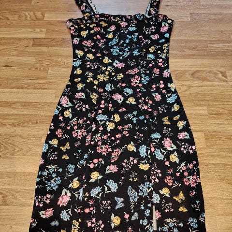 Steilmann sommerkjole i svart med flerfarget blomsterprint. Kjolen er i knelengde og har størrelse 40. Materialet er viskose som er lett og egnet for sommerbruk. Kjolen har tynne stropper og tre volangkant nederst.