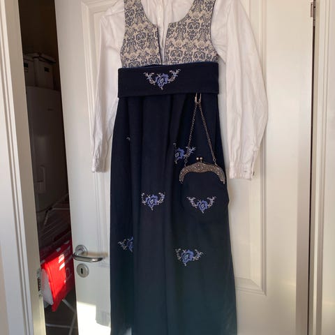 Nydelig Maya festdrakt fra Maxemilia. Lekker blå farge laget av 65% ull og 35% viskose, med for i 100% polyester. Passer til jenter i størrelse 104. Kjolen har broderte detaljer og bredt belte i livet.