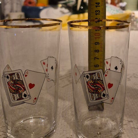 spillkort glass sett bestående av 3 glass. Glassene er transparente med dekorative spillkortmotiver og gullkant rundt toppen. Egnet til servering av drikkevarer.