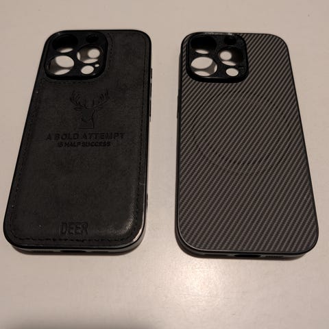 Apple Telefondeksler i svart skinnmateriale. Dekslene er designet for å beskytte telefonen og gir et elegant utseende. Passer for ulike Apple-telefonmodeller.