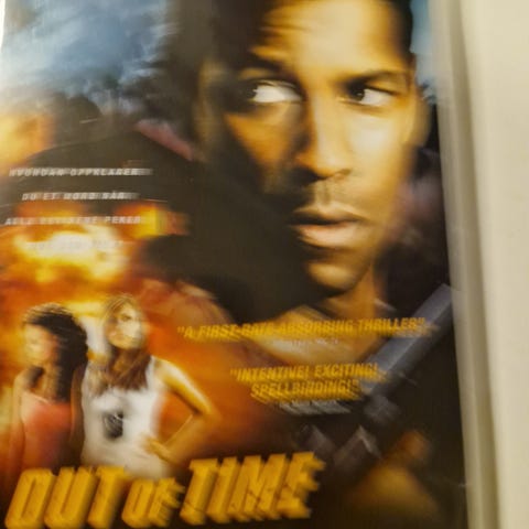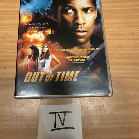 Out of Time DVD film featuring Denzel Washington on the cover. The DVD case shows the movie title and main actors. The cover design includes action-themed imagery.