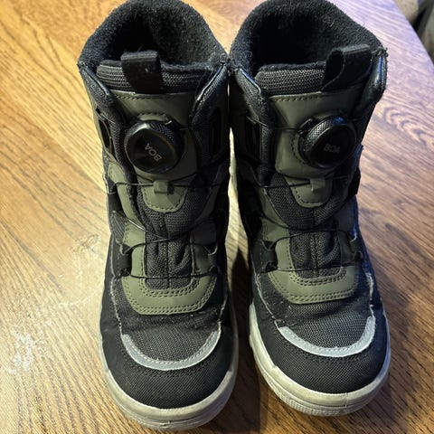 Superfit barnesko i størrelse 33. Skoene har en kombinasjon av svart og grønn farge med solide materialer som egner seg for utendørs bruk. De har en praktisk lukking med en dreieknapp for enkel tilpasning og godt feste.