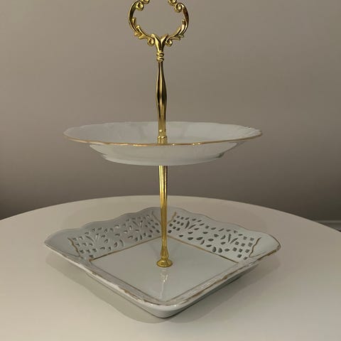 Vakkert etasjefat i sølvfarge med fine, gjennombrutte detaljer. Lett i vekt. Pent brukt. Litt bruksmerker enkelte steder, men ingenting som påvirker funksjon eller helhetsinntrykk. Se bilder for mål. Passer supert nå i førjulstiden – perfekt til julekaker, konfekt, småkaker eller frukt på festbordet. Kan demonteres slik at det ikke tar så mye plass når det ikke er i bruk. 😊