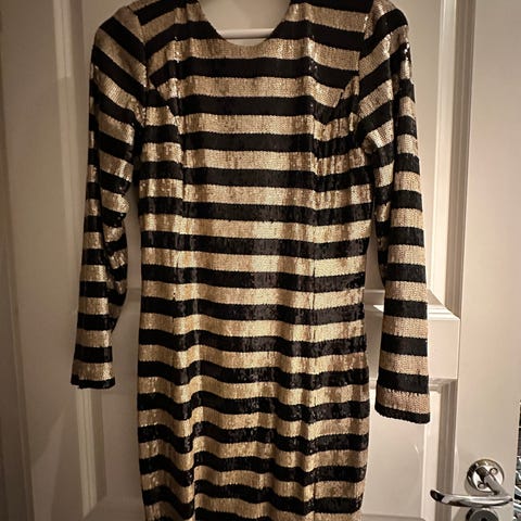 Mango festkjole i svart farge, størrelse M. Kjolen har et v-formet utringning og en drapert detalj på forsiden. Materialet har en lett glitrende effekt. Langermet design. Perfekt til julebord. Kun brukt 1 gang.